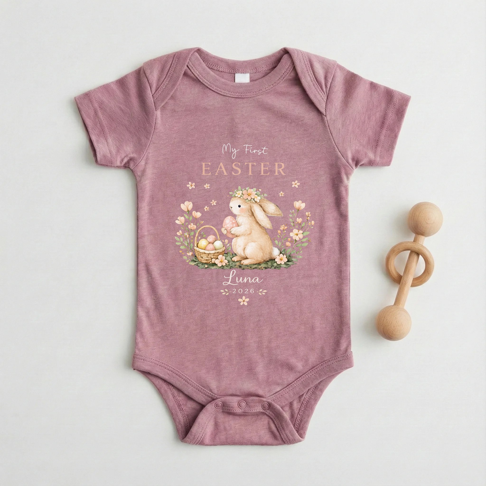 We ordered this personalized bodysuit for my daughter's first Easter, and it ended up being exactly what we wanted for our family photos. The organic cotton is incredibly gentle on her skin, and she seemed perfectly comfortable wearing it all afternoon. What really exceeded my expectations was the quality of the snap buttons, which felt very secure but were still easy to manage during quick diaper changes. It held its shape and the custom lettering perfectly after washing, and we received several compliments from the grandparents on how charming the design looked.