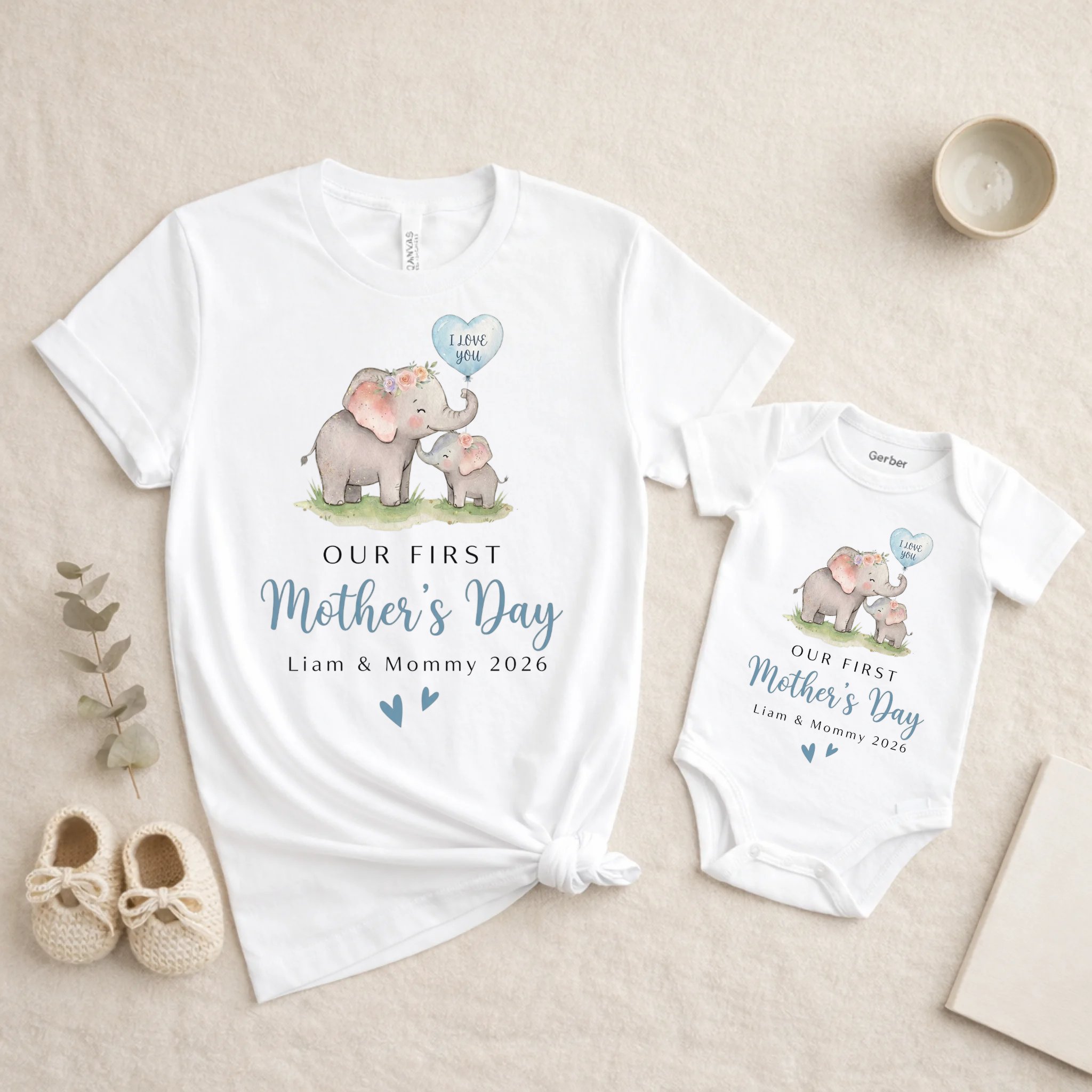 Welcome this remarkable milestone with our First Mother’s Day Matching Outfit. This personalized set is all about the unique bond between a mom and her baby boy, marked by a heartfelt design. Featuring a soft watercolor illustration of an elephant mom and baby, this outfit is a keepsake to treasure forever. Capture the emotion of your first Mother’s Day together with matching outfits that tell your story. Perfect for creating lasting memories.