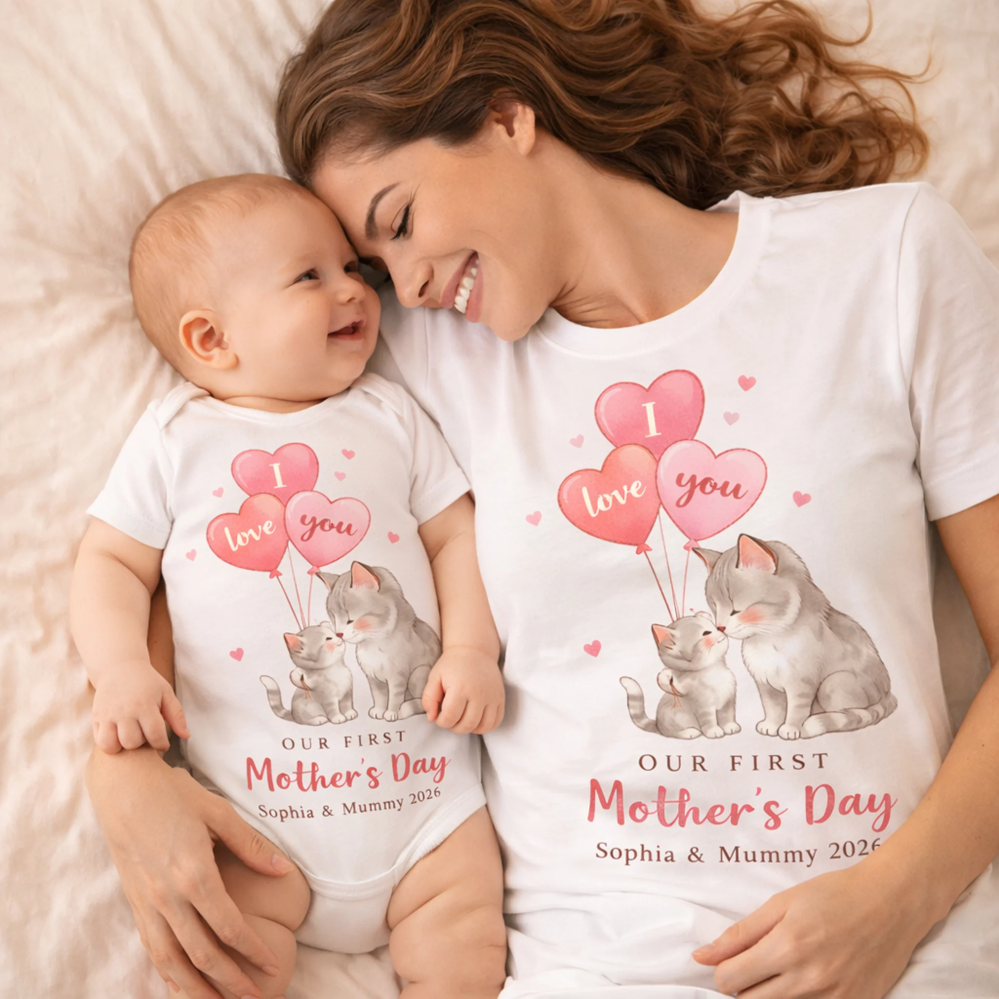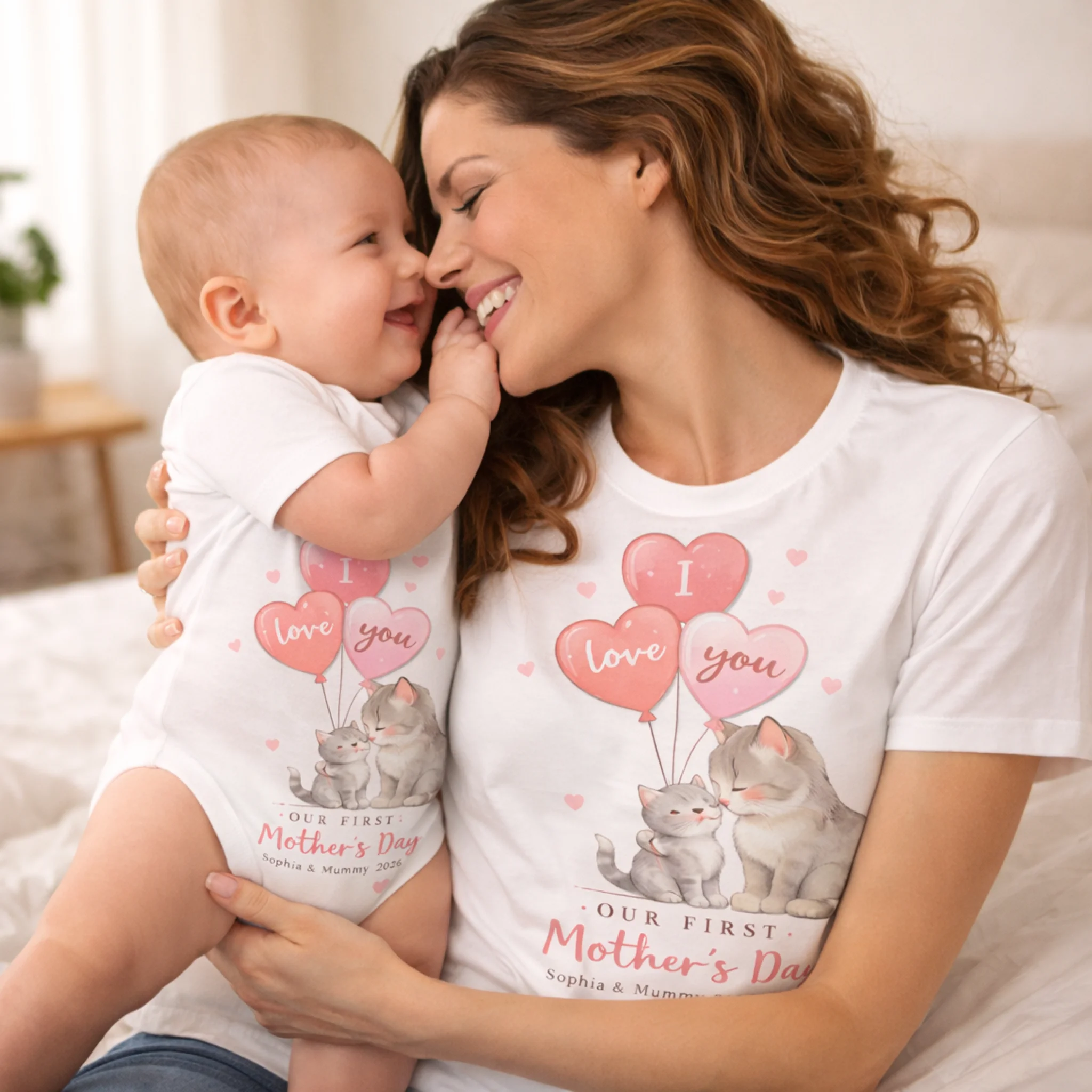 Imagine Sarah, a new mother, receiving this personalized matching first mother’s day bodysuit as a gift from her partner. On that special day, she dresses her baby in the bodysuit that reads “Baby Liam” while she wears a matching tee with “Mommy Sophia.” As they take family photos, the tears in her eyes reflect the deep connection and love that this simple gift symbolizes. Let us help you create a memory that lasts a lifetime! 🌟 Thank you for supporting our small shop 🧡